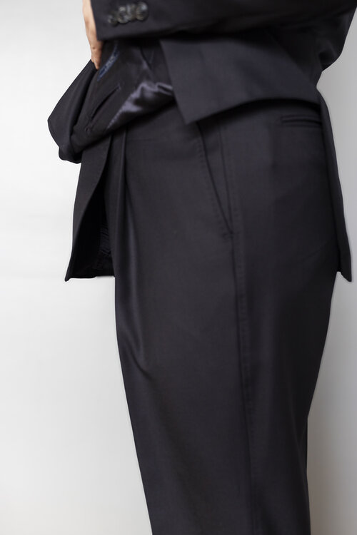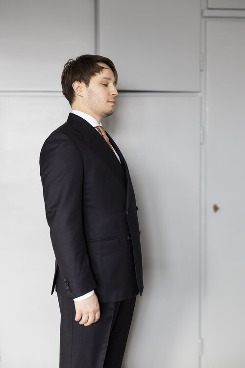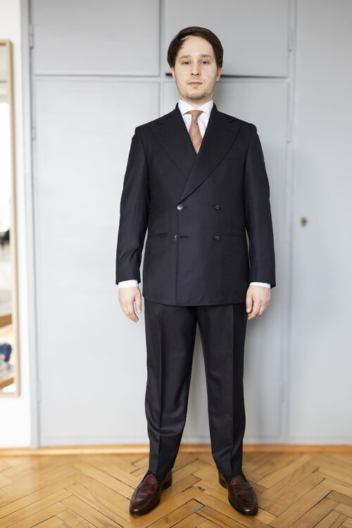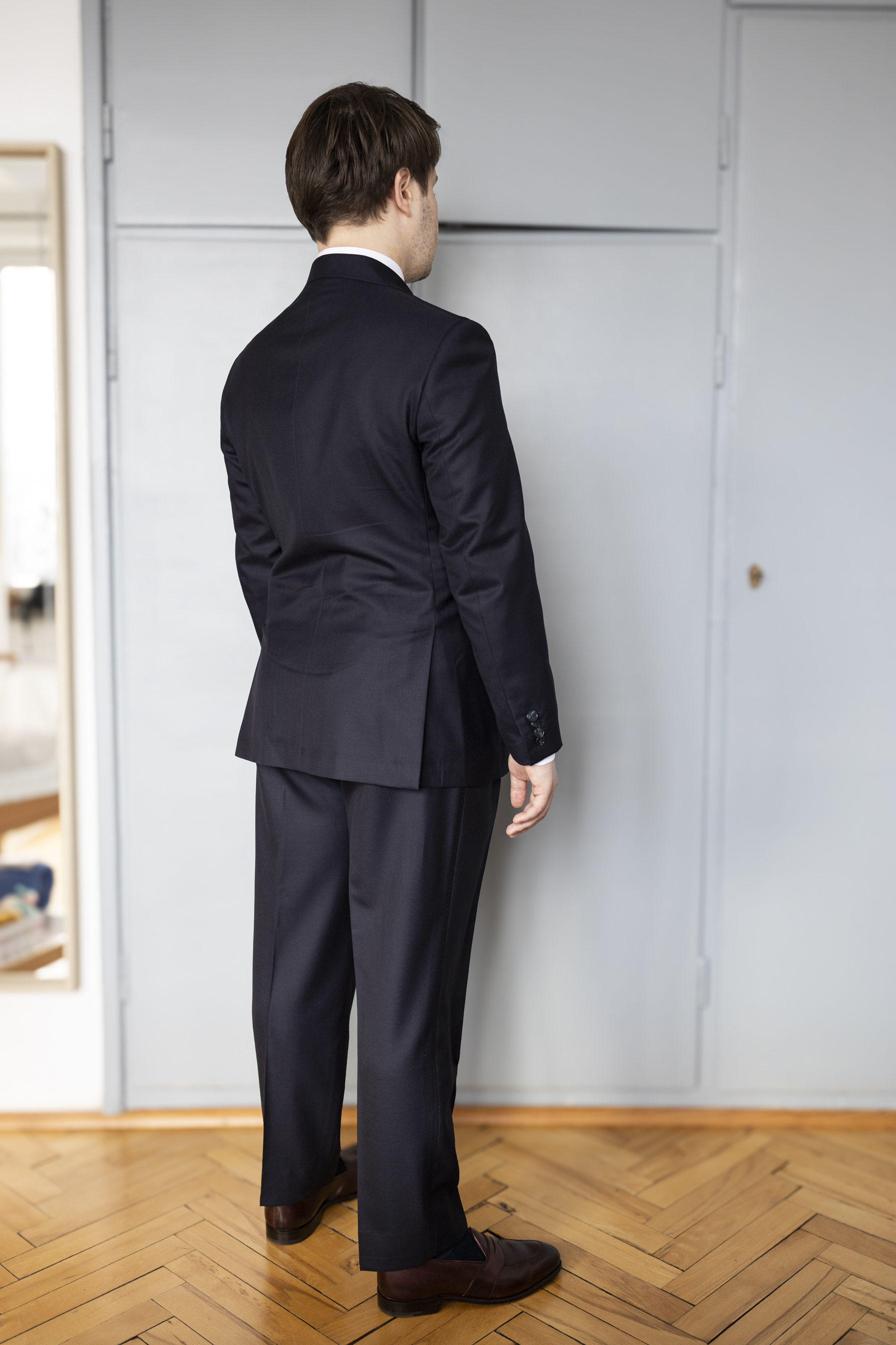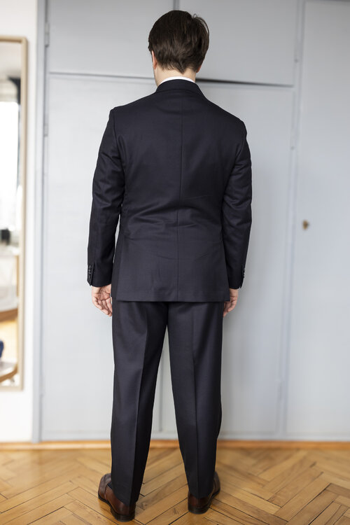 Dorzucę kilka słów od siebie wraz z roboczymi zdjęciami. Niestety mam mieszane uczucia. Tak jak wspominali koledzy wyżej – Armin to świetny gość, a udział w samej akcji był przyjemnością, jednak z otrzymanego produktu nie jestem zadowolony. Mam trudną sylwetkę, więc rozmowę zacząłem właśnie od tego tematu, pokazując zdjęcia obrazujące, jak układają się na mnie gotowe marynarki. Armin zapewnił mnie, że rozumie problem i mu podoła. Uważam jednak, że na tym polu poległ – plecy wyglądają po prostu źle. Nie ukrywam, że na pierwsze spotkanie przyjechałem z Krakowa mocno niewyspany, a i dla Armina był to pewnie wymagający dzień (byłem przedostatni w kolejce). Wyciągnąłem z tego lekcję: na przymiarki trzeba przychodzić lepiej przygotowanym i więcej mówić. Zwykle zakładam, że oddając się w ręce eksperta, mogę mu w pełni zaufać, nawet jeśli sam nie mam sprecyzowanej wizji. W moim przypadku to jednak nie działa i gra zespołowa daje zdecydowanie lepszy rezultat. Pamiętam także, że to preferencyjno-pilotażowa akcja, ale druga przymiarka w ciemnym mieszkaniu z małym lustrem nie była zbyt komfortowa. Z tego względu przede wszystkim zaufałem oku Armina, a więcej czasu poświęciliśmy na rozmowę niż na oglądanie gotowego ubrania. Podsumowując: największy zarzut mam do pleców i ciągnącego w górę przodu. Dodatkowo prawy rękaw został za mocno skrócony / marszczenie, które, jak zgaduję, jest źle wszytą podszewką, ciągnie go za mocno do góry. Mam też wrażenie, że zakładka w spodniach zbyt mocno się otwiera i nie wygląda to najlepiej. Na koniec: szwalnia bardzo słabo poradziła sobie z prasowaniem, zostawiając sporo odbić na delikatnej tkaninie. Oczywiście uczciwie wyślę Arminowi moje uwagi wraz ze zdjęciami i dam znać, co odpowie. Chętnie też usłyszę, co Wy myślicie, i zobaczę Wasze realizacje. Zdjęcia pokazują mnie w najbardziej naturalnej pozycji. Mogę się trochę wyprostować i zapewne garnitur będzie wyglądał ciut lepiej (co widać na ostatniej fotografii). -