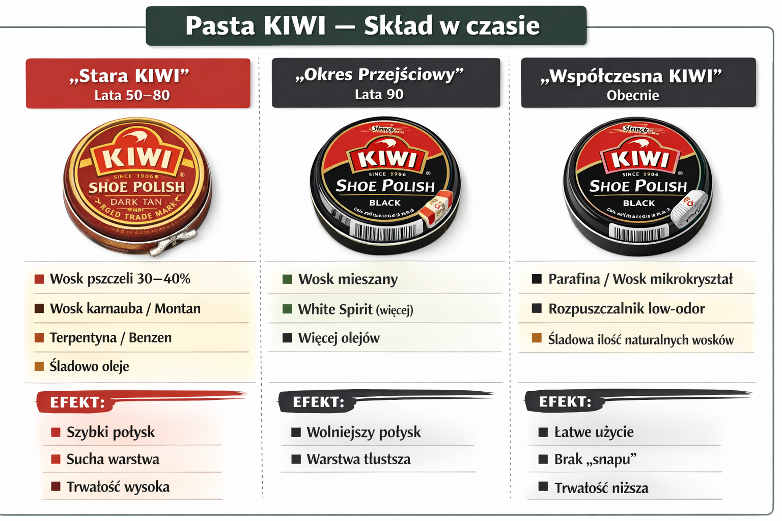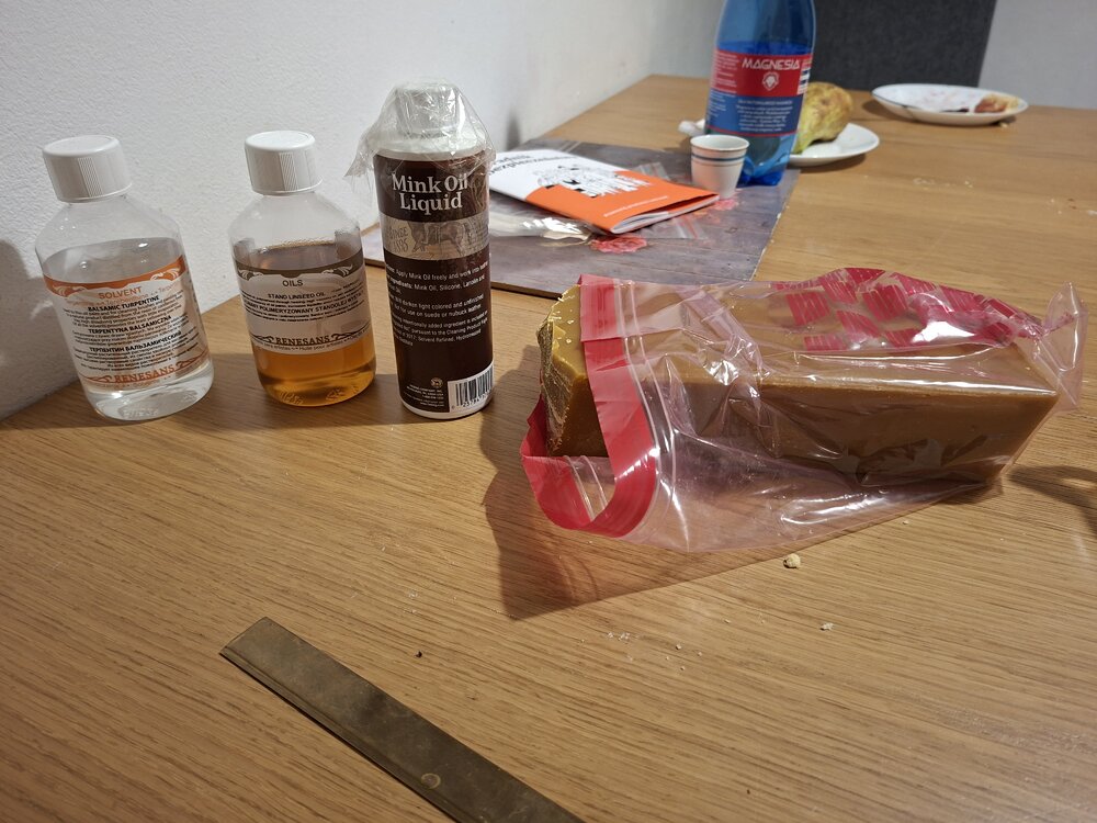 Panowie Czy ktoś może bawił się w robienie samodzielnie past, kremów do butów i podobnych? Żeby nie było, uważam produkty np. Saphira za bardzo dobre, ale postanowiłem trochę zgłębić temat. A wszystko zaczęło się od... oleju z norek, który jak się okazuje, ma około 2 % oleju z norek. Winowajca jest na zdjęciu - przynajmniej ma tyle przyzwoitości, by być ciałem płynnym, a nie stałym! Siedzę sobie i przeglądam Internet, grupki rekonstruktorów i podobne, oraz archiwalne składy past do butów. Bardzo ciekawe, jak np. zmieniał się skład pasty Kiwi na przestrzeni lat (informacje moje, tabelę narysował oczywiście Chacik): Generalnie, największą różnicą w vintage pastach i tych współczesnych, był rozpuszczalnik. Stopniowo terpentynę zastępowano najpierw benzyną lakową, a obecnie benzyną ciężka obrabiana wodorem (hydrotreated heavy petroleum distillates). Terpentyna, mimo naturalnego pochodzenia, jest jednak toksyczna w wysokich stężeniach, ma też intensywny zapach (z tego też powodu zniknęła w dużej mierze ze współczesnych pracowni malarskich). Jednakże, zapewnia dużo lepsza penetrację skóry niż współczesne rozpuszczalniki, a intensywny zapach paradoksalnie jest zaletą przy toksyczności (bo ostrzega o zbyt wysokim stężeniu w powietrzu). Poza tym, będę pastował buty, a nie stał cały dzień nad sztalugami! W każdym razie, pierwsze, co uwarzyłem, to naturalny odpowiednik wosku Barboura do impregnacji bawełny. Receptura historyczna, czyli w równych porcjach: terpentyna, wosk pszczeli i olej lniany (ja użyłem polimeryzowanego, gdyż surowy zbyt dużo by schnął i polimeryzował spontanicznie pod wpływem powietrza). Wygląda to tak: Pachnie hmm.. Powiem tak: moi dziadkowie mieli starą szafę, gdzie w dolnej szufladzie trzymali pasty i szczotki do butów. Pachnie to dokładnie tak. Drewno, wosk, silny żywiczny aromat. Czy działa - cholera wie. Przyznam, że trochę boję się woskować kurtkę (to bardzo duża powierzchnia) w pomieszczeniu, wolałbym robić to na zewnątrz, co teraz jest cóż, niemożliwe. Nałożyłem więc trochę DIY pasty, w ramach eksperymentu, na buty zimowe. No i czekam na kolejny składnik - 100 % olej z norek. Zobaczymy co wyjdzie dalej.12 punktów
