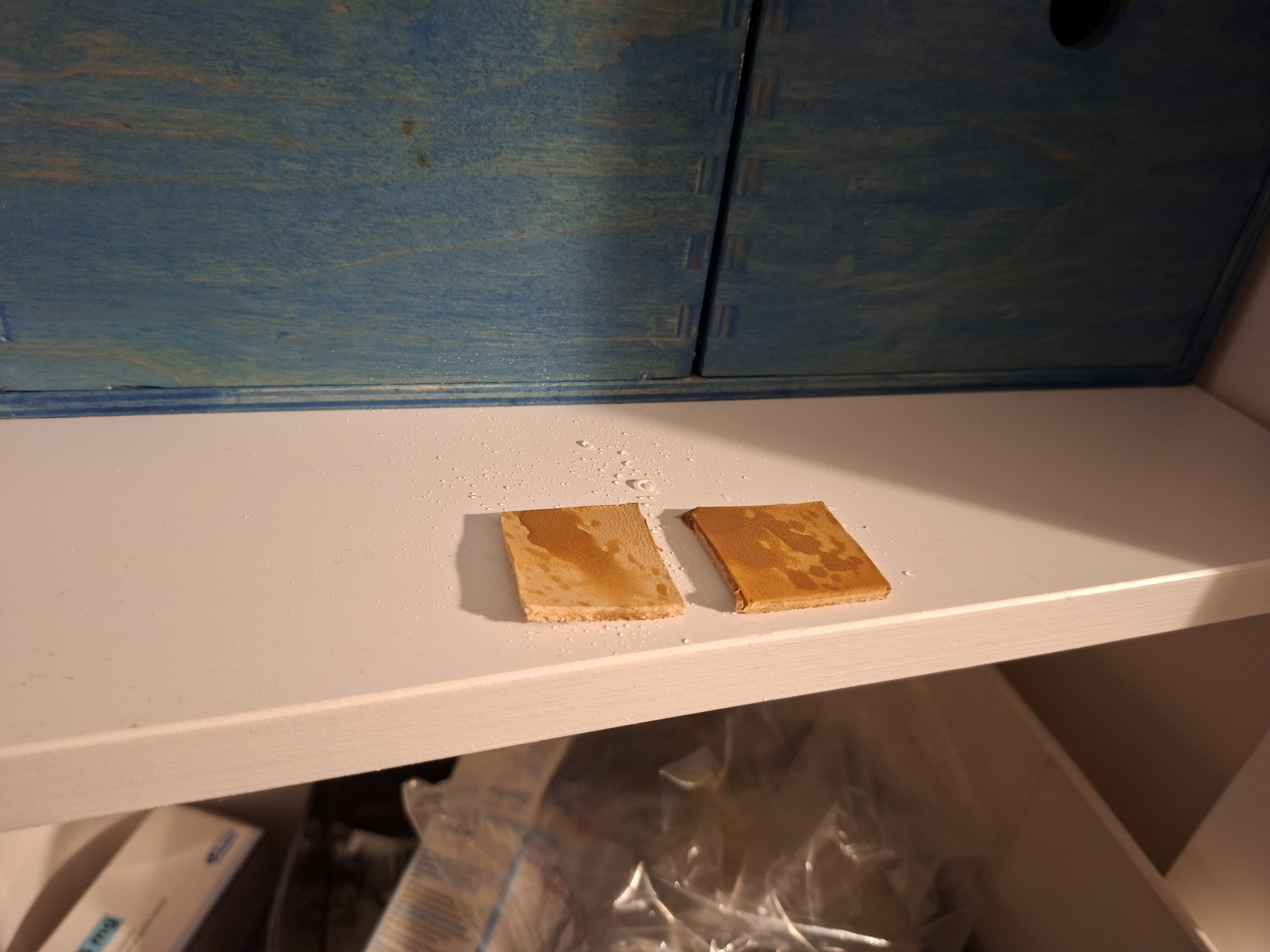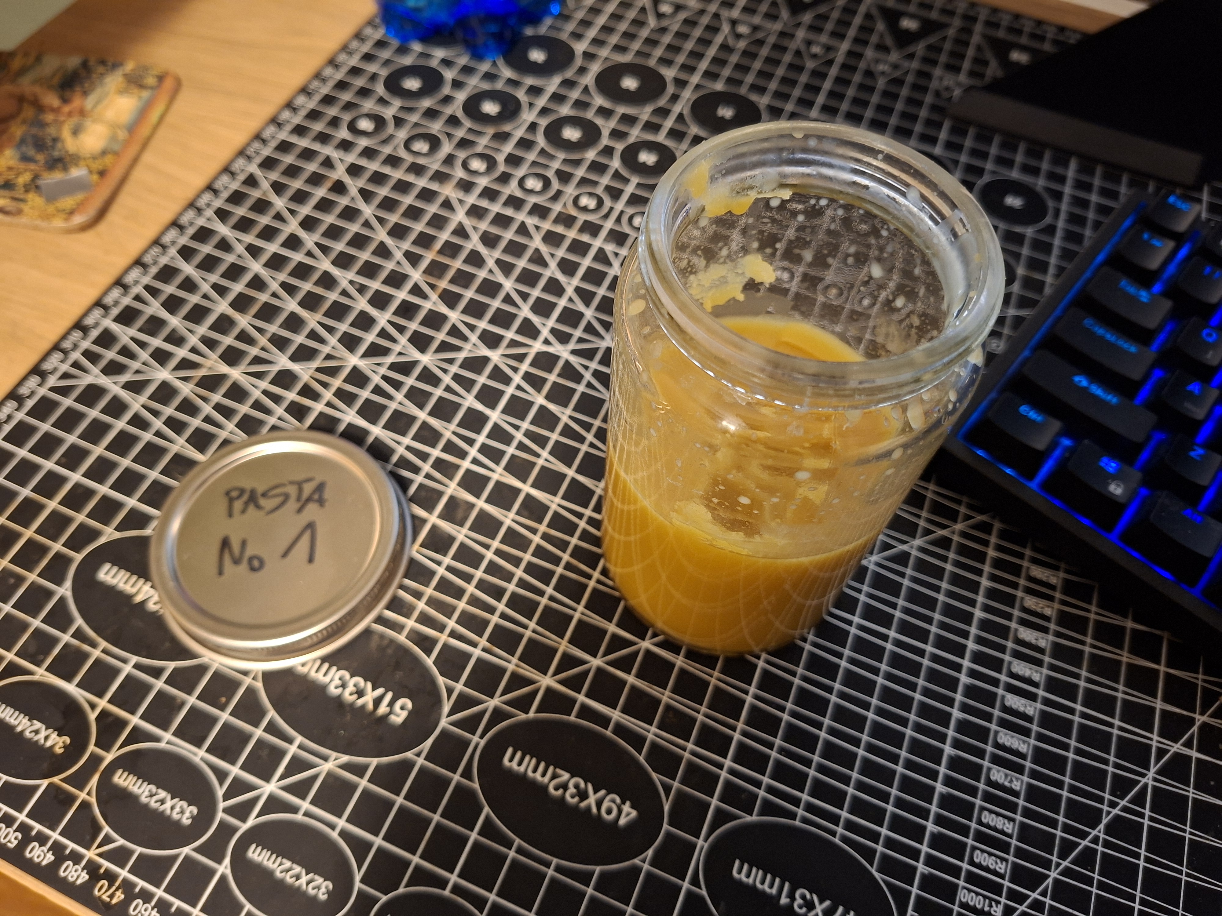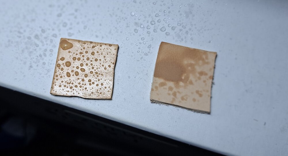 Postanowiłem robić testy, na pierwszy ogień poszła Pasta nr 1 w zastosowaniu na skórę. Obiektem testowym jest garbowana roślinnie skora niebarwiona od Conceria Walpier (tak wiem, że to absurdalne, ale to jedyna niebarwiona / niezabezpieczona skóra jaką mam w domu) Pasta ma zaskakująco dobrą penetrację i bardzo dobrze się wchłania, to tylko spekulacja, ale sądzę, że dzięki terpentynie. Po przetarciu szmatką jest równomierny, półmatowy połysk. Pasta nie penetruje skóry na wskroś, osadza się głównie na licu, widać to z boku na przekroju. Pasta nie zmiękcza skóry. Po jej zastosowaniu skóra jest wręcz lekko SZTYWNIEJSZA - w sumie nic dziwnego, skoro 1/3 wagowo to czysty wosk naturalny, a po odparowani terpentyny w sumie pewnie jeszcze więcej. Nic się nie kruszy ani nie łuszczy, to chyba zaleta dodania oleju lnianego. Skóra po jej zastosowaniu jest nieco przyciemniona, ale dużo mniej niż przy użyciu np. olejów do skór. Wodoodporność - zaskakująco dobra, ale nie idealna! Tutaj macie próbkę po nałożeniu jednej warstwy pasty i dla porównania próbkę niczym niezabezpieczoną (w skrócie - ta chłonie wodę jak gąbka). Woda perli się, po wytarciu jej szmatką pozostają drobne kropeczki w miejscu, gdzie była.5 punktów