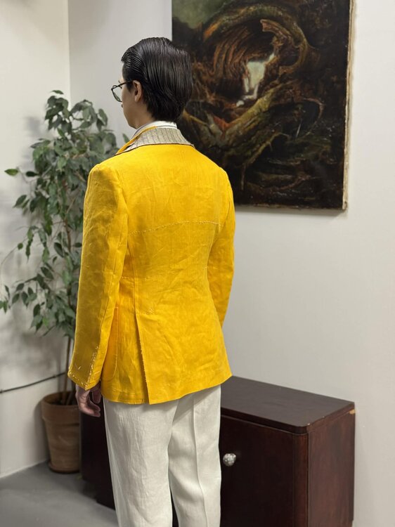Prezentowałem już w tym dziale realizacje kilku topowych pracowni/krawców z Trójmiasta i okolic. Tym razem wybór padł na chyba najmłodszy taki zakład na mapie Trójmiasta – Dapper’s Bespoke w Gdańsku. Dapper’s działa w salonie Nie tylko dla Dżentelmenów, a ten adres lokalnym elegantom raczej już będzie znany. Krawcem jest tutaj Dawid Trybański, którego zresztą znam i obserwuję jego rozwój w fachu od wielu lat (przez jakiś czas uczył się m.in. u Sergiusza Tarasenki w czasie kiedy obstalowałem tam spodnie). Pomysł na projekt? Ten kadr powinien powiedzieć wszystko: W zamyśle wydawało się, że będzie łatwo. Białe, lniane odd trousers i letnia, żółta marynarka. No to teraz konia z rzędem temu, kto znajdzie sensowną tkaninę na marynarkę. Ja i Dawid szukaliśmy niezależnie chyba z pół roku. Większość albo wchodziła w bardziej kanarkowe lub musztardowe rejony lub sama tkanina była zbyt garniturowa. Kolorem i fakturą pasował de facto tylko Carnet z próbnika Jersey Jackets (B&Tailor lubią z niego szyć), ale to bardzo lejący i luźno tkany blend, więc bałem się odkształceń i zaciągnięć. W końcu mega pomocna obsługa Alfred Brown nakierowała mnie na tkalnię Spence Bryson i to było dokładnie to! Perfekcyjna, nasycona żółć i dość luźno tkany, ale masywny i sztywny len. W kwestii konstrukcji i kroju zdałem się na krawca, bo przeglądałem wcześniejsze realizacje i wybijał się w nich wyrobiony styl, który mi się podobał. W międzyczasie Dawid zamówił biały len na spodnie z Solbiati. Pierwotnie myślałem o hollywood waist, ale Dawid zaproponował mi inne rozwiązanie, które jego zdaniem zapewnia lepszą stabilność spodni w pasie zwłaszcza przy tak lejącej tkaninie. Wychodzi z tego „udawany hollywood”, w którym szlufki są przesunięte w taki sposób, że pasek zakrywa łączenie. Na pierwszej przymiarce byłem w biegu, więc poniższe fotki wrzucam już z drugiej przymiarki. Efekt jaki jest, każdy widzi: Konstrukcja full-canvas zrobiona jest ze stosunkowo sprężystego, średniej grubości płótna, do tego cienkie poduszki żeby subtelnie wyrównać mocno opadające ramiona. W połączeniu ze sztywnym i masywnym lnem nie powiedziałbym, że jest „miękko”, ale za to marynarka super buduje sylwetkę. Zwłaszcza klatkę, co też fajnie optycznie niweluje efekt moich szerokich bioder. Wizualnie wygląda to mega atrakcyjnie. Współpraca z Dawidem jest bardzo przyjemna i rzeczowa. W trakcie spotkań dużo tłumaczy, różne technikalia objaśnia od razu przekładając na praktyczne użytkowanie/układanie się odzienia. Przymiarki na tyle dokładne, że ja nie byłem nawet w stanie wyłapać większości drobnostek, które Dawid chce jeszcze doszlifować. Wiem za to, że ma jeszcze jedno wyzwanie – znaleźć pasującą kolorystycznie nić jedwabną do butonierki po mediolańsku. 😃 Na następnym spotkaniu najprawdopodobniej odbiór. Na marginesie, usłyszałem od Dawida, że przymierza się do trunk show w Warszawie, chyba w marcu. Szczegóły pewnie będzie wrzucał na swoich socjalach.15 punktów