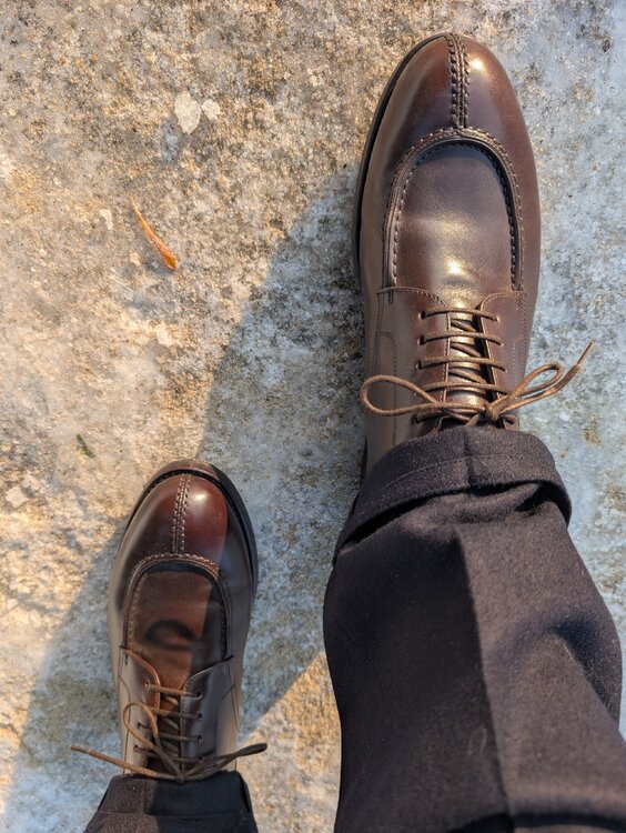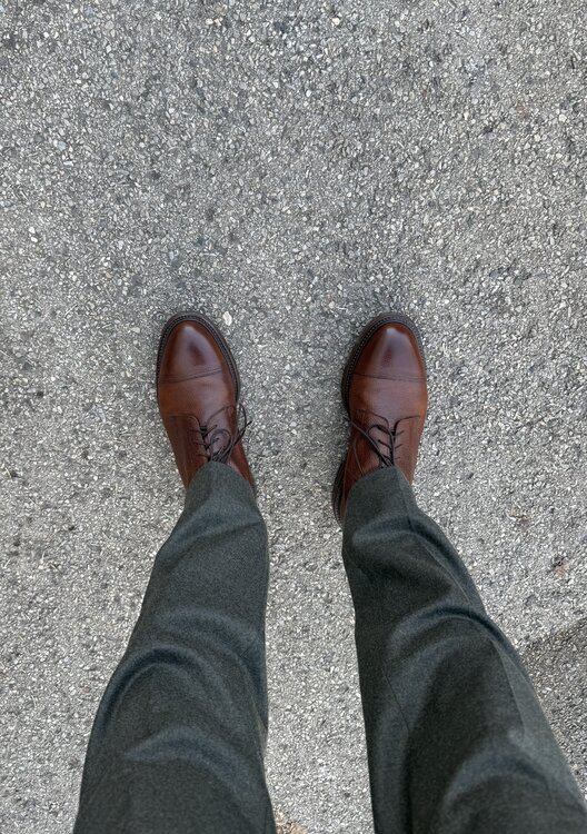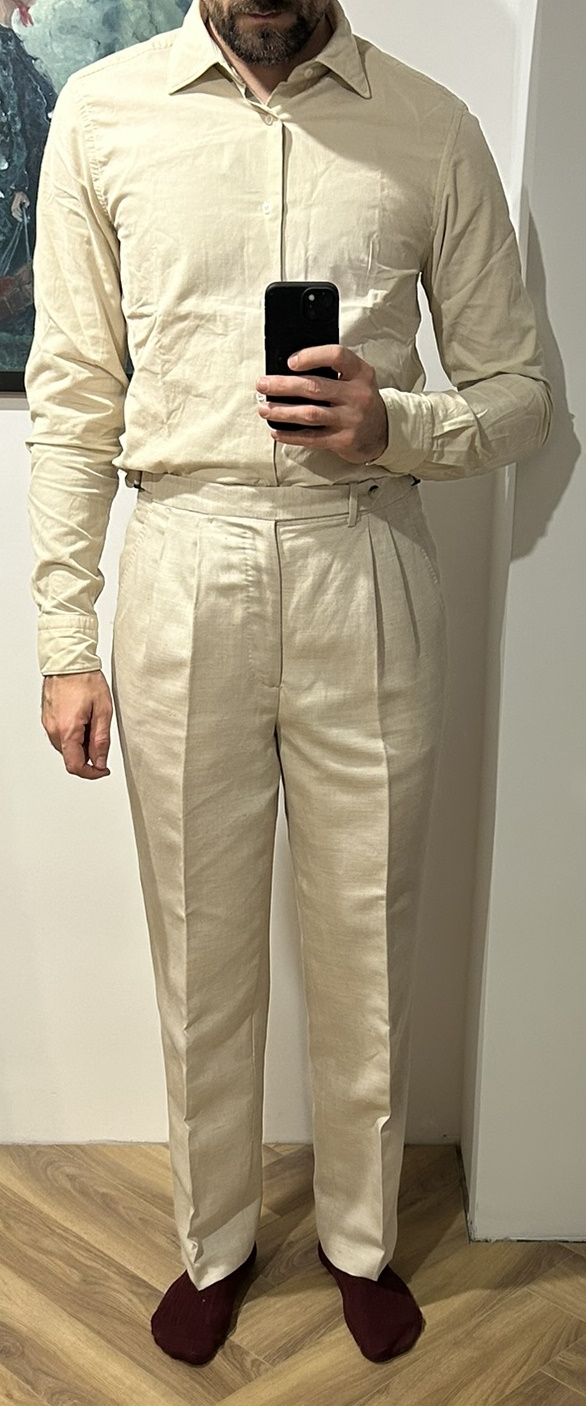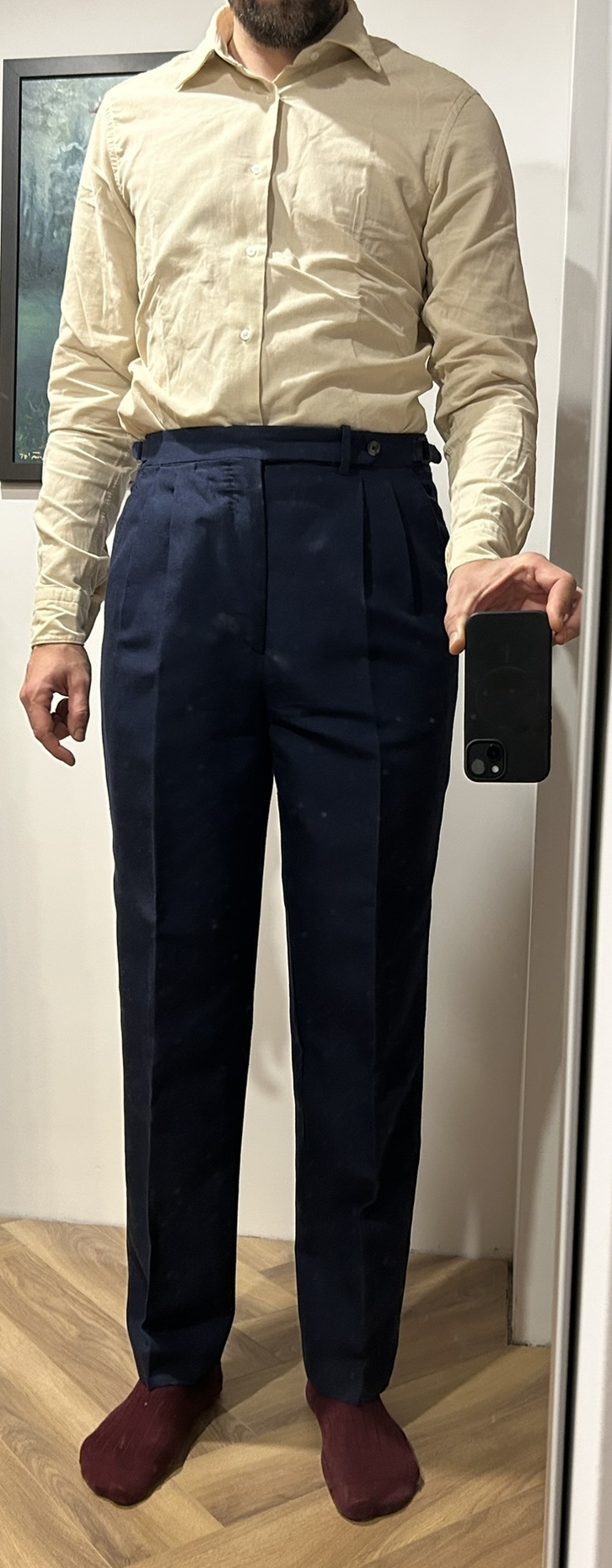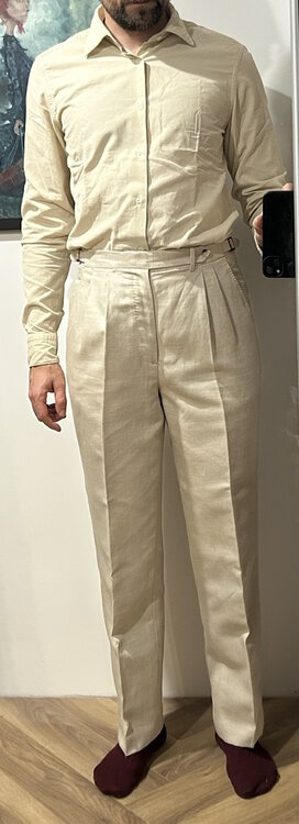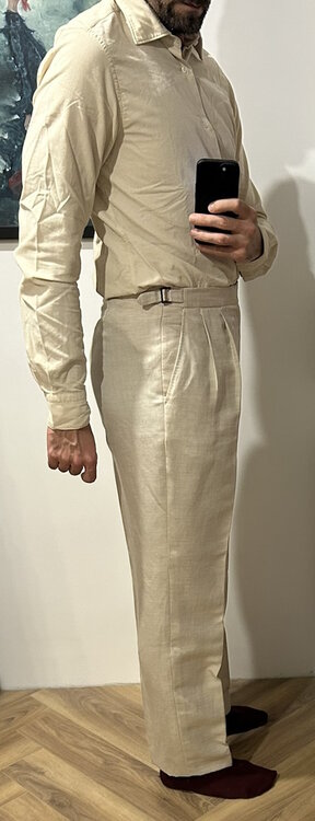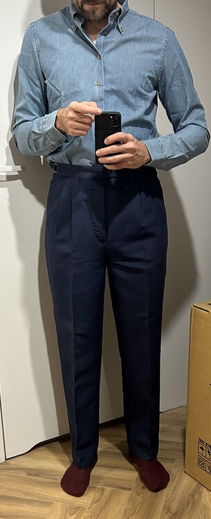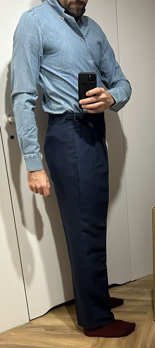 @mds, pewnie, pstryknąłem parę zdjęć, na lepsze fotki nie mam aktualnie warunków. Obie pary zwężone mniej więcej od połowy uda do dołu. Na dole finalnie są węższe o 1 cm, mierząc na płasko - 22,5 zamiast 23,5cm. Jest optymalnie. Tutaj nie można przesadzić, bo góra, co widać na moich zdjęciach, jest solidna i przesadne zwężanie da komiczny "carrot effect". Telefonowym obiektywem ciężko o dobre zdjęcie z bliskiej odległości, żeby nie zakrzywić rzeczywistości, ale starałem się. PS. Przy okazji polecam koszule Granqvist - obie powyższe świeżo wyjęte z pudełka, przymierzyłem przy okazji. Od jakiegoś czasu kupuję właściwie tylko tam. Powyżej widać denimowy BD z kontrastowymi guzikami i beżowy mikrosztruks (bardzo miękka i przyjemna w dotyku). Nie wiem, jak ten sztruks będzie się stażał i zachowywał po prasowaniu, ale jak na razie odczucia bardzo pozytywne.4 punkty