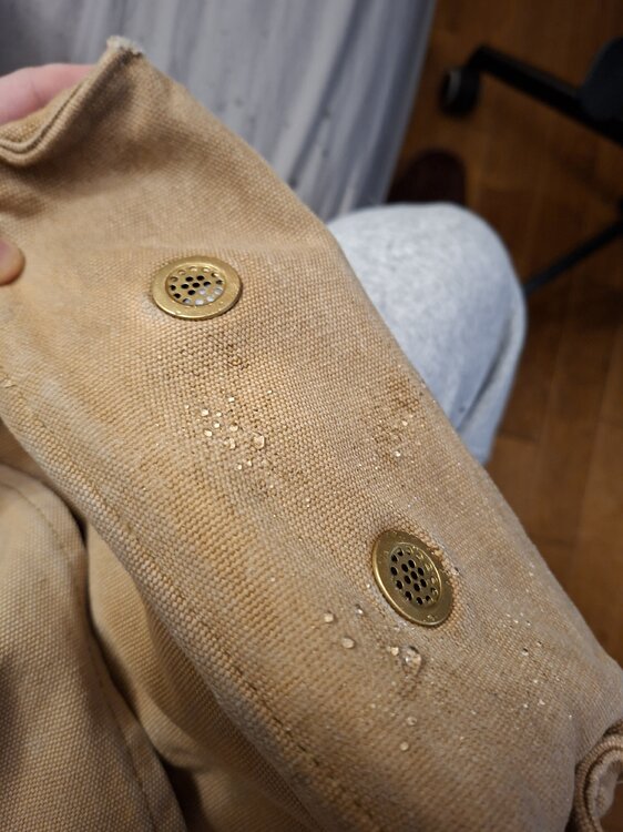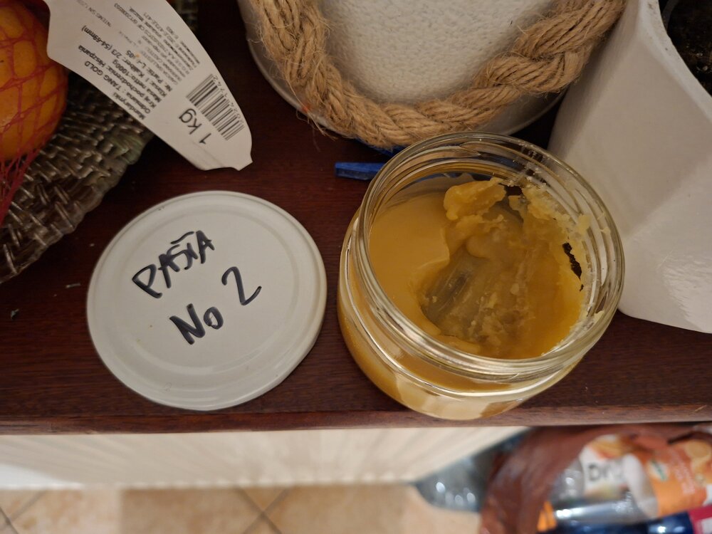No to test Pasty No 2. Postanowiłem iść od najprostszych do coraz bardziej skomplikowanych, i na własnej skórze przekonać się, czy działają, dlaczego tak, dlaczego nie, i co by tu zmienić. Parafina 65 % / wosk pszczeli 35 %. Czyli podobno klasyk. Receptura nawet nie tyle prosta, co prostacka. Jest to produkt w temperaturze pokojowej twardy, trudny w nakładaniu. Nawet roztopiony ma tendencję do formowania grudek i kruszenia się. Wydajność jest niska - żeby zaimpregnować materiał, trzeba go naprawdę sporo. Dodatkowo patrząc, jak pracuje na tkaninie, jest więcej niż pewne, że będzie się wykruszał i wymagał stałego uzupełniania - brak mu plastyczności, co zapewniał m.in. polimeryzowany olej lniany Pasty No 1. Są jednak pewne zalety. Przede wszystkim to produkt w 100 % bezpieczny i nietoksyczny, można nawet go zjeść, ryzykując co najwyżej sraczkę. Jest również bardzo tani - parafina za kilogram kosztuje kilkanaście złotych. Wosk trzy - cztery razy drożej. Wodoodporność hmmm ... jest? Nie uchroni przed ciężkim deszczem, ale zapewnia pewną odporność na wilgoć. Mówiąc z angielska, jest to bardziej water-resistant a nie water-proof. Jako ciekawostkę mogę dodać fakt, że kostki o dokładnie takim składzie Fjallraven sprzedaje pod nazwą Greenland Wax (za cenę około dwadzieścia razy wyższą niż koszt składników do samodzielnego przygotowania) i przedstawia to jako ósmy cud świata.3 punkty