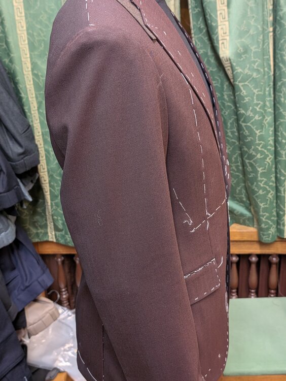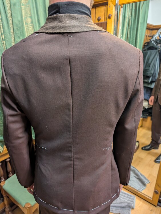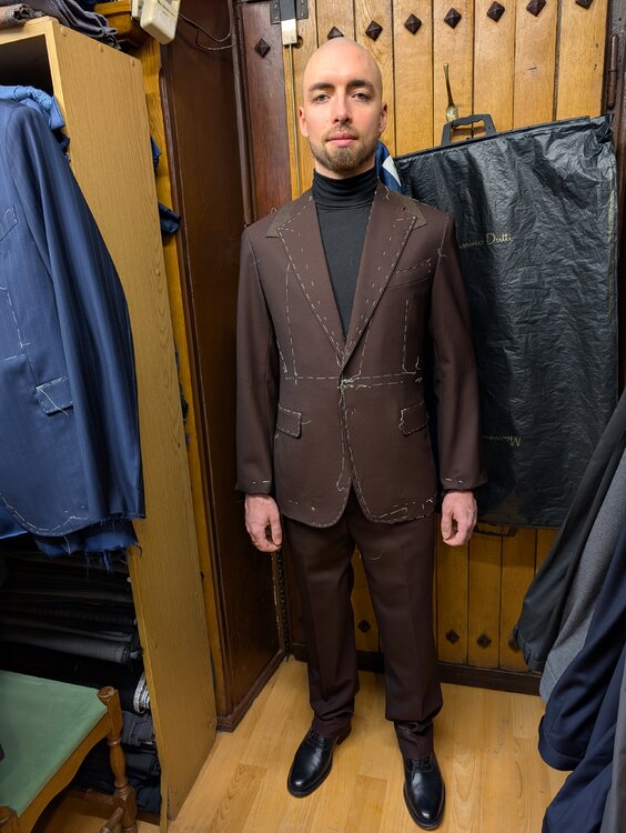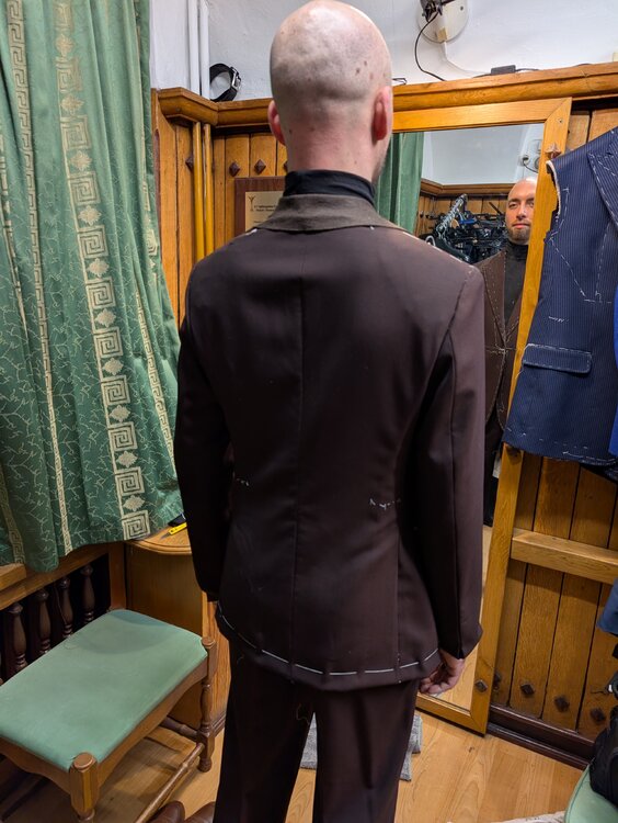Trzecia przymiarka. Jedną rzeczą, o którą poprosiłem pana Błońskiego, a w którą zaczynam trochę wątpić, było zaszycie zakładek kilka centymetrów niżej, niż standard. Było to podyktowane chęcią zrobienia jak najbardziej prostych linii zakładek. Tym razem nie uchwyciłem efektu, ale wydaje się to wizualnie je spłycać. Byłem niezadowolony, że pan Błoński nie uzgodnił ze mną kształtu i pozycji kieszeni w marynarce (chciałem zrobić hacking pockets), ani zapięcia w spodniach (zrobił na guzik, kiedy preferowałbym wydłużony pas na haczyk). Fundamenty wydają się jednak solidne. Co do marynarki, pan Błoński wsadził sporo paddingu, ale nie wiem, czy nie przydałoby się jeszcze więcej. Rozważam też większe otwarcie / rozcięcie pół na dole, żeby wizualnie wydłużyć linię nóg. Być może odrobinę większe wcięcie w talii — ale póki co idę strategią "poszerzać w ramionach zamiast ciąć talię". Pan Błoński będzie je jeszcze poszerzał o pół centymetra, efekty zobaczymy na następnej przymiarce. Co sądzicie?4 punkty