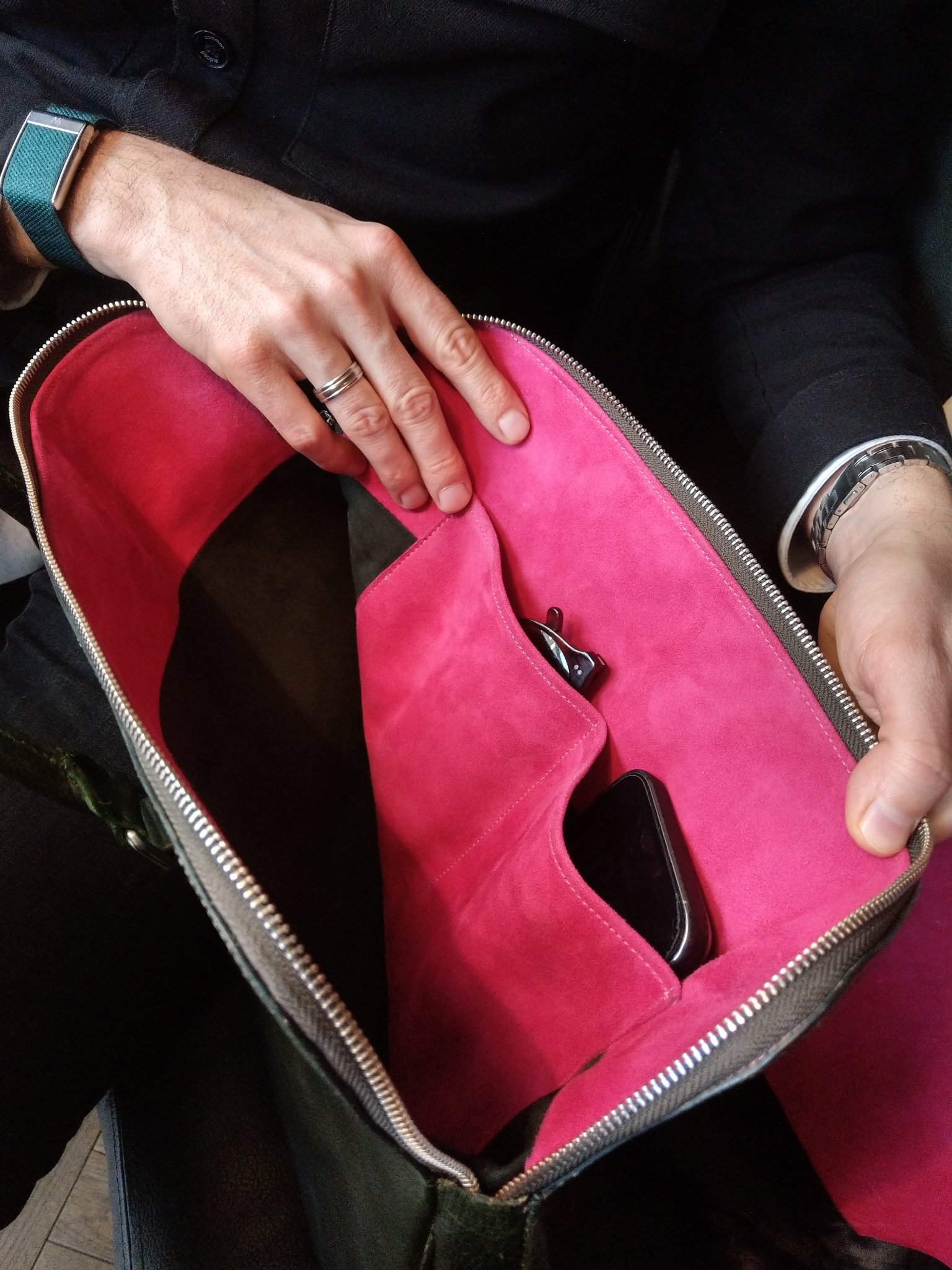 Bespoke projekt lekkiej teczki bez usztywnień. W środku kozi zamsz, w kolorach fuksja u góry / zieleń na dole. -