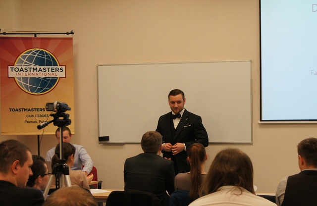 Wczoraj występowałem dla Toastmasters Poznań i musiałem się trochę odstrzelić. Postanowiłem zainspirować wystąpienie Jamesem Bondem więc założyłem ciemny garnitur i muszkę, a do sali zjechałem na linie z helikoptera ... niestety kamerę włączyli chwilę po tym jak wpadłem przez okno zbijając szybę ;)